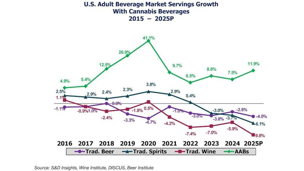 On a servings dimension foundation during which RTD spirits equals 8 ounces; FMB equals 12 ounces; conventional wine equals 5 ounces; conventional beer equals 12 ounces; and conventional spirits equals 1.5 ounces, AAB with hashish has a 15.8% share of the market, which whole 127.9 billion servings. When eradicating hashish drinks, the story doesn’t change as various alcoholic drinks have additionally outperformed over the previous 10 years. Though share for AAB drops to 13.4%.